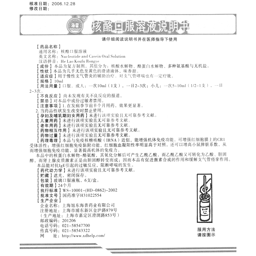 【药品名称】 核酪口服溶液(海普)【通用名称】 核酪口服溶液【规格型号】 10ml*6支【生产企业】 上海旭东海普药业有限公司【批准文号/生产许可证号】 国药准字H31022554【有 ...